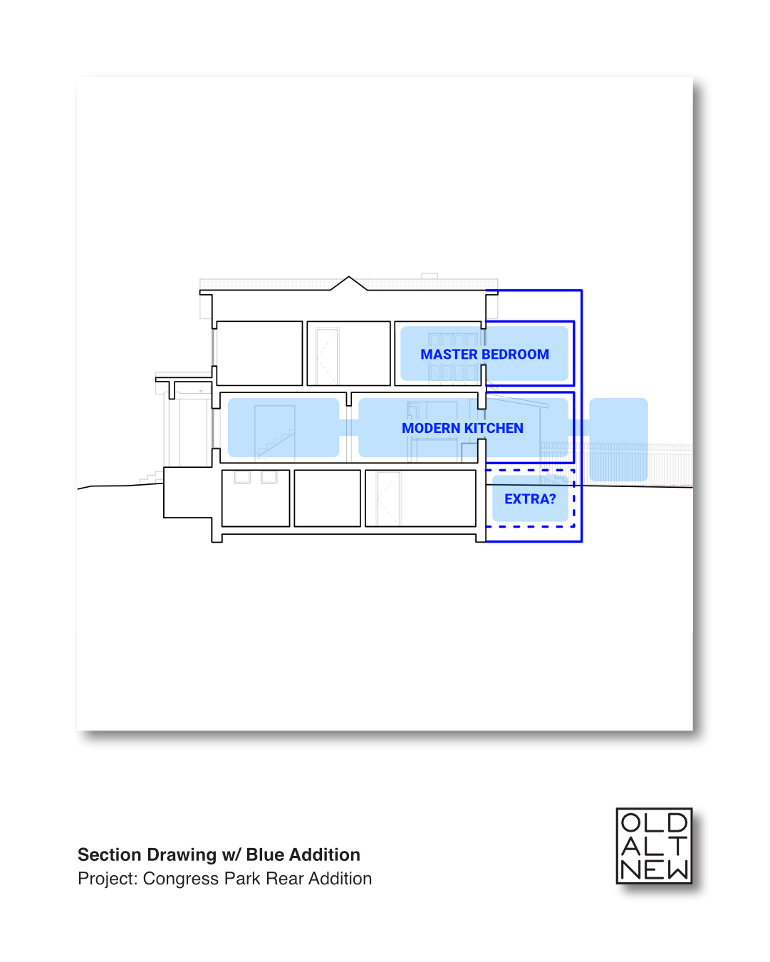 This project is a two-story rear addition (450 gross square feet) that adds a modern kitchen, dining, storage, entry and outdoor entertaining spaces to the first floor, and creates a full master bedroom suite on the second floor.